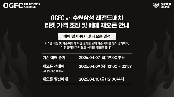 "축구 팬들 피드백 300% 공감" OGFC vs 수원삼성 레전드 매치, 티켓 가격 조정 발표